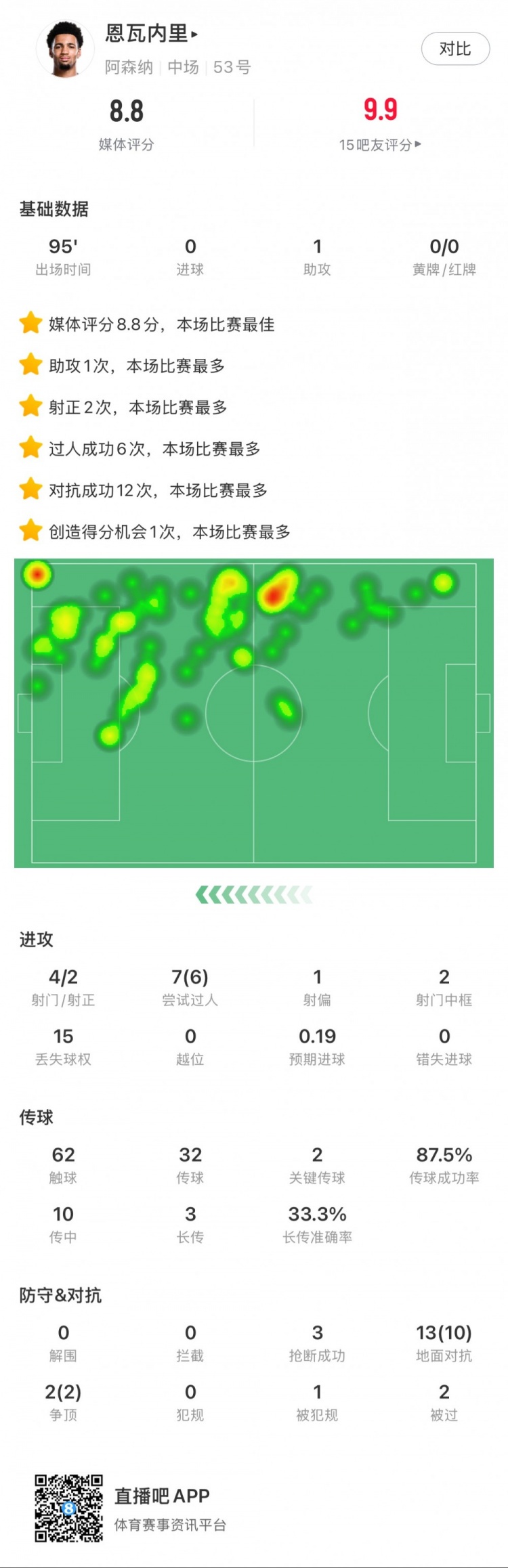 DB官网在线登录入口枪手17岁小将恩瓦内里闪耀全场,送出一次助攻,完成6次过人,有5项数据全场最高。赛后吧友给他打出了9.9分的超高分。